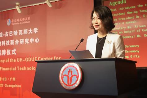 哈瓦那大学副董事长及与中国学术科学关系协调员Dionisio Zaldivar Silva博士受哈瓦那大学董事长委托,发表了热情洋溢的致辞。他高度肯定雍和明董事长一行今年6月对哈瓦那大学的成功访问,积极评价中古两国长期交流合作结下的深厚情谊,急切期待联合研究中心能尽早落地,结出实实在在的果实,服务双方金融教育研究与人才培养,服务古巴国家建设特别是金融事业发展。